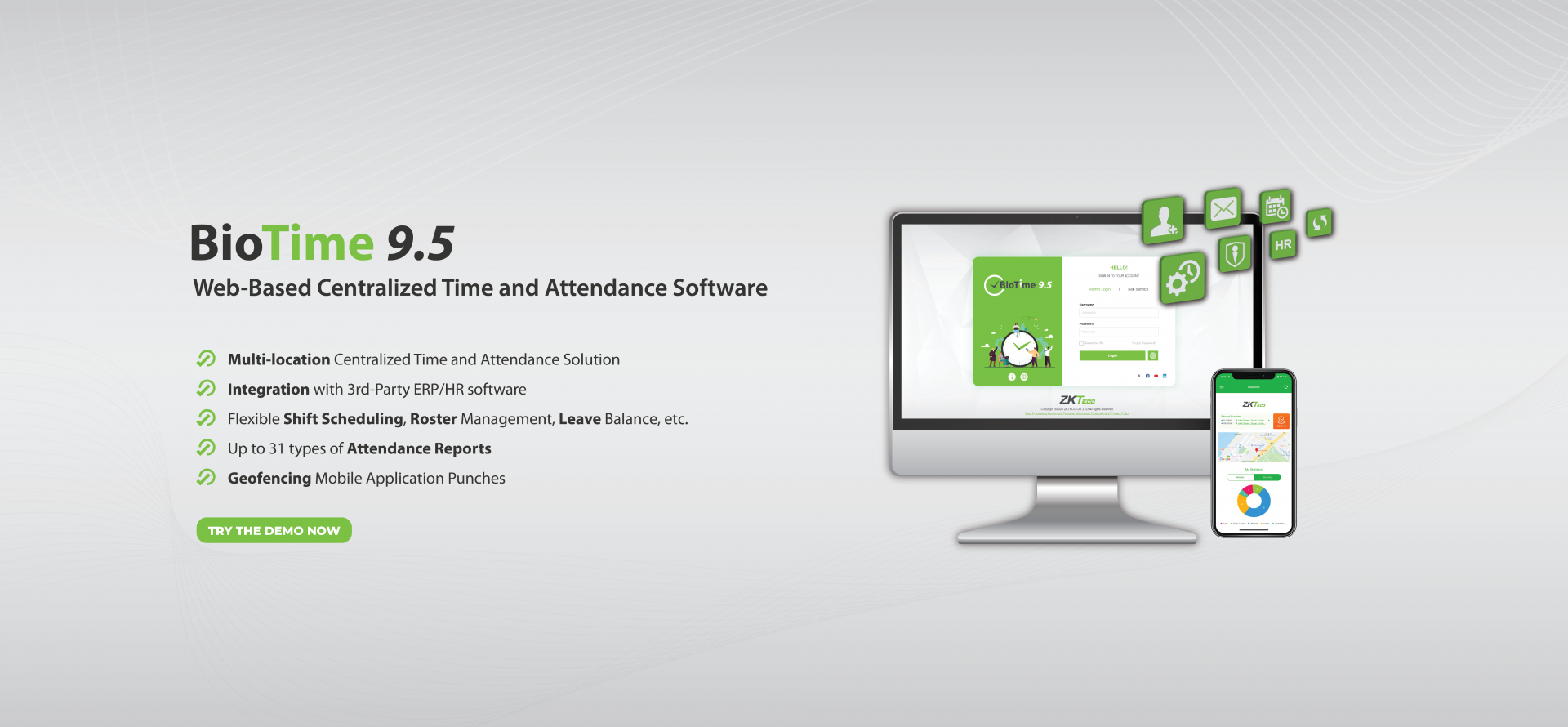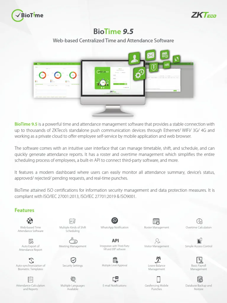 BioTime 9.5 is an advanced time and attendance management software that connects ZKTeco devices through Ethernet, Wi-Fi, 3G, and 4G networks. It operates as a private cloud platform, allowing employees to access self-service features via web browsers and mobile applications. The system enables easy management of employee schedules, shifts, and attendance records, while providing real-time monitoring, reporting, and integration with third-party software through its built-in API. It also complies with international standards including ISO/IEC 27001, ISO/IEC 27701, and ISO 9001.